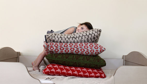 Little house shaped pillow (yellow and brown) and Cloud shaped pillow (white and grey stripes)