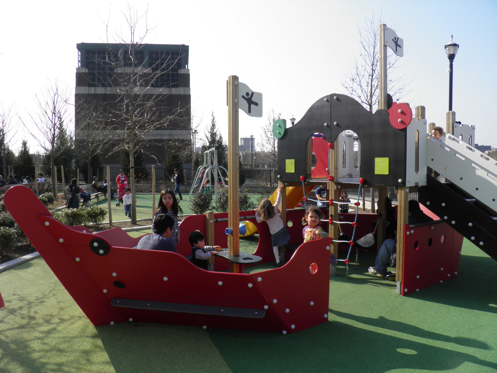 Have you heard the buzz yet? Newport Green, the fabulous waterfront park & playground in downtown Jersey City, was opened to the public earlier this year. The park is only partially finished – The Oval and the playground are open, but the Fountain Plaza is still under construction. If you haven’t been there yet, I suggest you plan a visit soon. But beware – it gets packed! So time your visit wisely. It’s more bearable in the morning when most of the kids are at school.