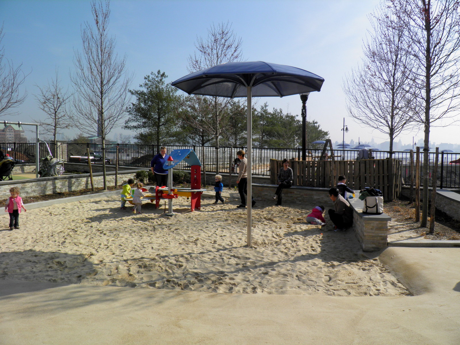 There are a few umbrellas around the playground, however, they are on the smaller side. They also planted quite a good amount of trees in the playground but they are new and leaf-less for now (or were in mid March when I took these pictures). I promise to post more pictures once the trees turn green.