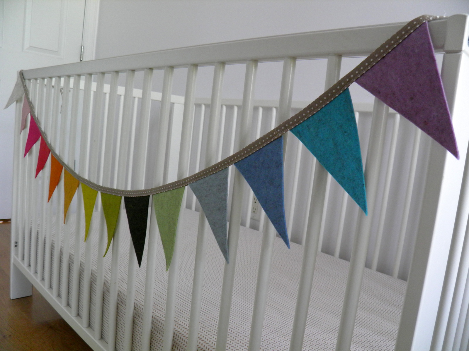 I admit I didn’t do much in the past couple of weeks – potty training my 1.5-year old (who, by the way, was sick and had to visit the emergency room) consumed most of my time and energy. There’s a pile of new fabrics on my sewing desk, including new organic fleece for my soon-to-come line of organic blankets. That’s still in the making. However, I managed to finish my very first flag bunting. These 14 fierce triangles create one lovely and unisex nursery/children’s room decoration. It is made from thick & soft high quality European heathered felt (it’s 1.5 mm thick so it holds its shape really well). It has tons of character – uniqueness is guaranteed (and so is the über coolness). Spice up those walls, shelves, or windows and add some character to your child’s space.