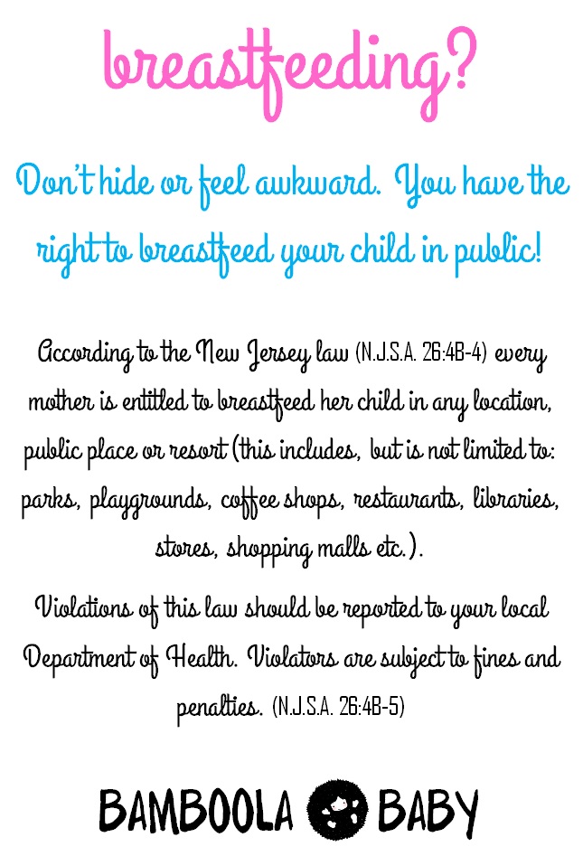 We have a law here in New Jersey (since 1997) which protects the rights of nursing mothers and their breastfed children. The law sets forth the importance of breastfeeding and clarifies that women have the right to breastfeed their children in public. This was one of the first laws that provided fines and penalties for its violation. So next time you feel harassed in any public space due to breastfeeding, know your rights and know you can (and should) report this violation.